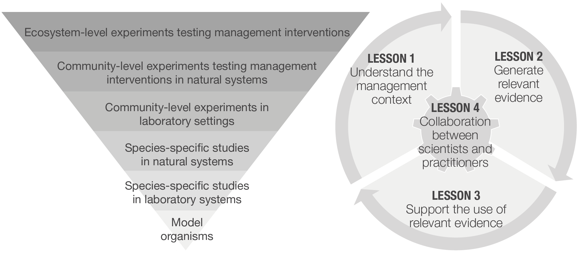 Left: A robust evidence base to support successful management practices, based on an incremental scaling up in spatial extent and ecological complexity. Right: Four elements involved in supporting effective knowledge exchange.