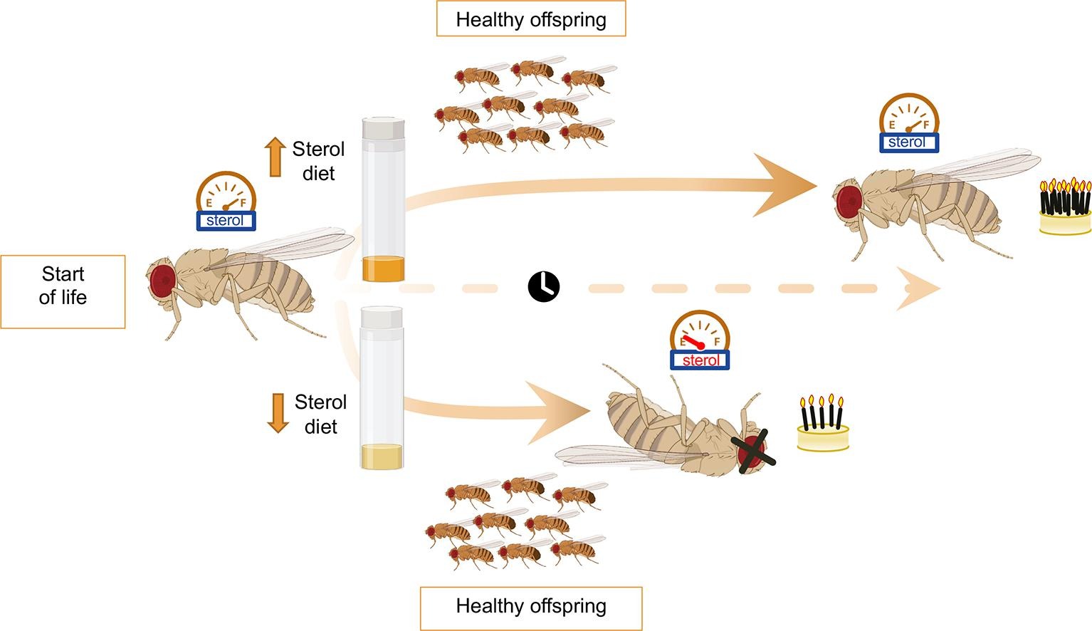 Our recent findings in Drosophila melanogaster show that supplementing flies on macronutrient-rich diets with additional cholesterol can extend lifespan to the same extent as DR, while also sustaining high egg production. Thus, DR may be beneficial for lifespan because it reduces egg production which in turn reduces the mother’s demand for sterols, thus supporting longer lifespan. It is also possible that mothers live longer and lay more eggs on high sterol diets because the diet triggers enhanced somatic maintenance and promotes egg production, but at the cost of diminished egg quality.